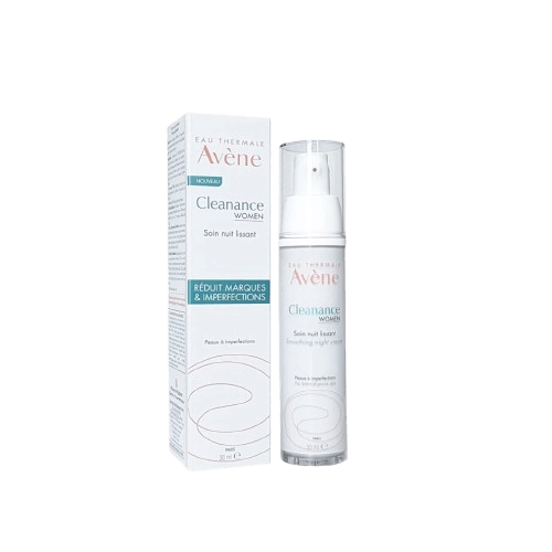 Cleanance Women Soin nuit lissant est destiné aux peaux adultes à imperfections. Il présente une efficacité à plusieurs niveaux, grâce au Synovea™ HR qui contribue à réduire les imperfections et limite l’oxydation du sébum* à l’origine de l’apparition des points noirs et au Rétinaldéhyde qui favorise l’atténuation des marques résiduelles, et l’Eau thermale d’Avène aux propriétés apaisantes et anti-irritantes.