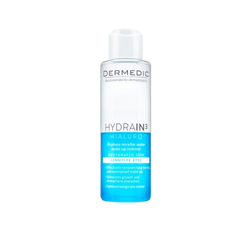 Dermedic Hydrain le Démaquillant eau micellaire biphasé permet d’enlèver même le maquillage hydrofuge, sans sensation de peau tendue ou sèche