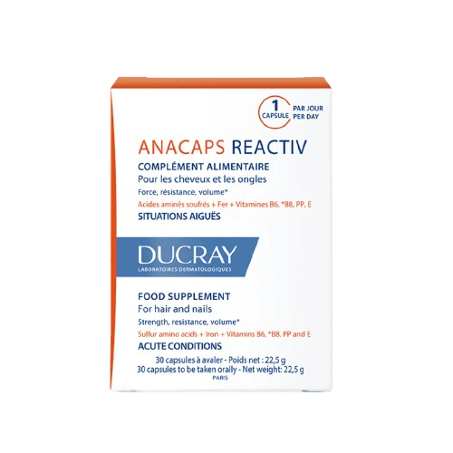 Anacaps Reactiv apporte au bulbe pilaire les nutriments essentiels (Vitamine E, Vitamine PP , Vitamine B6, Vitamine B8 ).