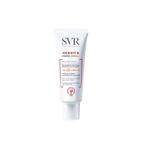 CICAVIT+ Crème SPF50+ est formulée avec une technologie filtrante anti-UVA/UVB et un complexe anti-oxydant anti-lumière visible et infrarouges, la crème cible tous les types de rayons pour limiter les risques de marques rouges et brunes.